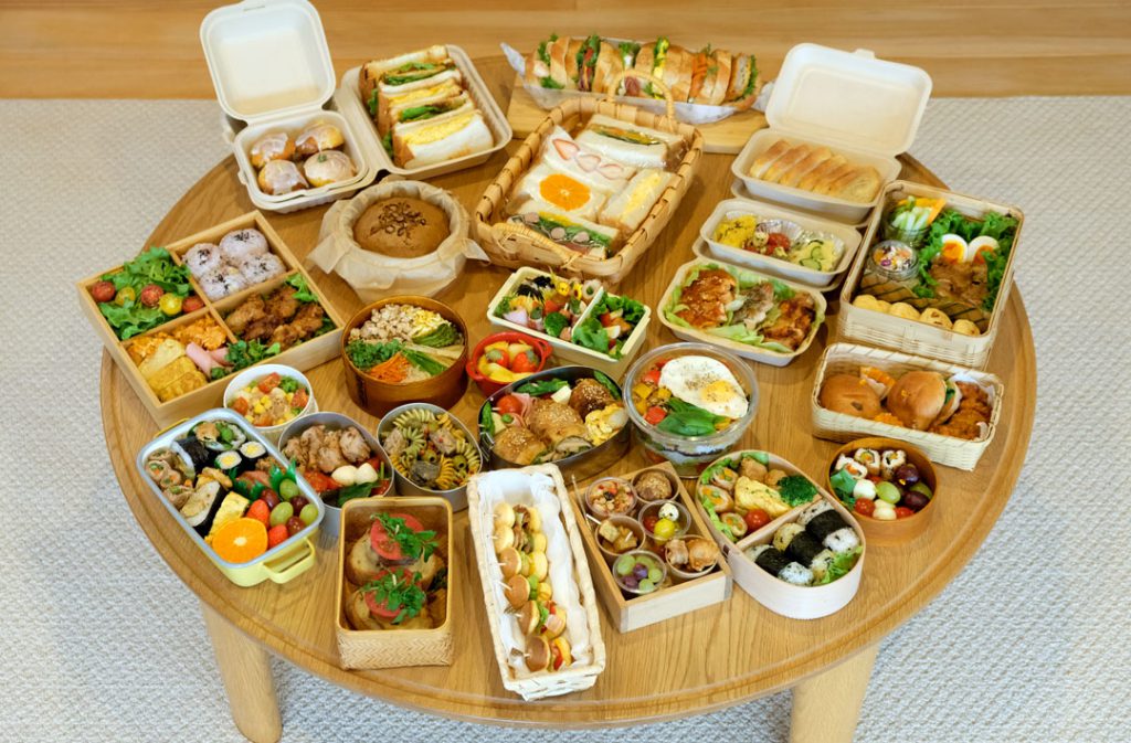 ①参加者全員のお弁当を匿名で集め、テーブルに並べる。