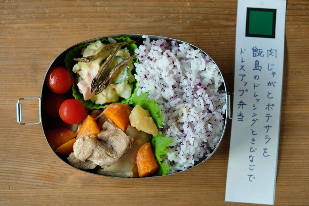 「肉じゃがとポテサラを甑島のドレッシングときびなごでドレスアップ弁当」