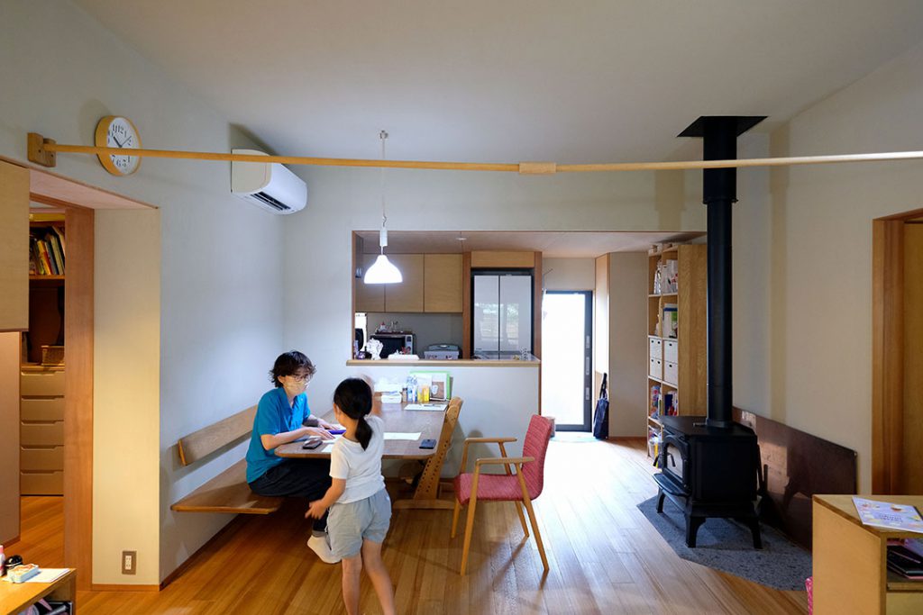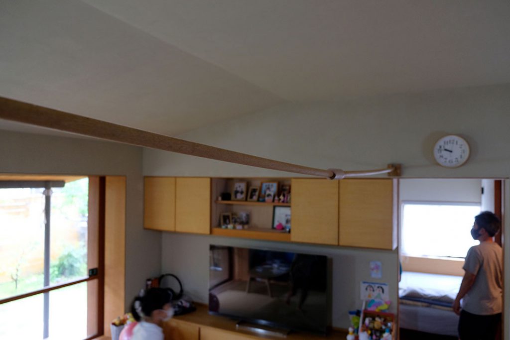 TVボードの棚の扉を外して見せる収納に変更したり、お庭に戸口を取り付けたり、小さな変更はそれまでもありましたが、最初の大きなご相談はお引渡しから5年目のこと。ダイニングと畳リビングの間に、カーテンで簡易的に仕切れるようなバーを設置したい、というものでした。3m近い“超ロング物干し”です。