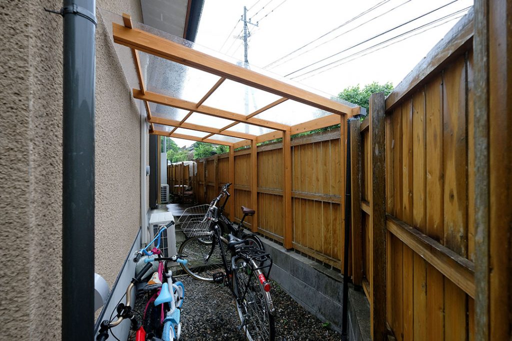 勝手口側に余白として残していた外部スペースがあり、そこに自転車置場を造作しました。家族分の自転車を置かれていて、屋根付きなので雨に濡れるのを抑えられます。