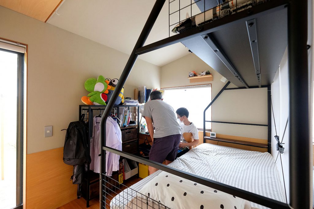 お家の中を見させていただくと、寝室の使い方が少し変わっていることに気づきました。お子様2人を想定した子ども室はご長男とご主人でシェア。ご夫婦の寝室はご長女と奥さまでシェアされているのです。どうしてこのような配置なのか尋ねてみると、“就寝のタイミングと習い事”が関わっていました。