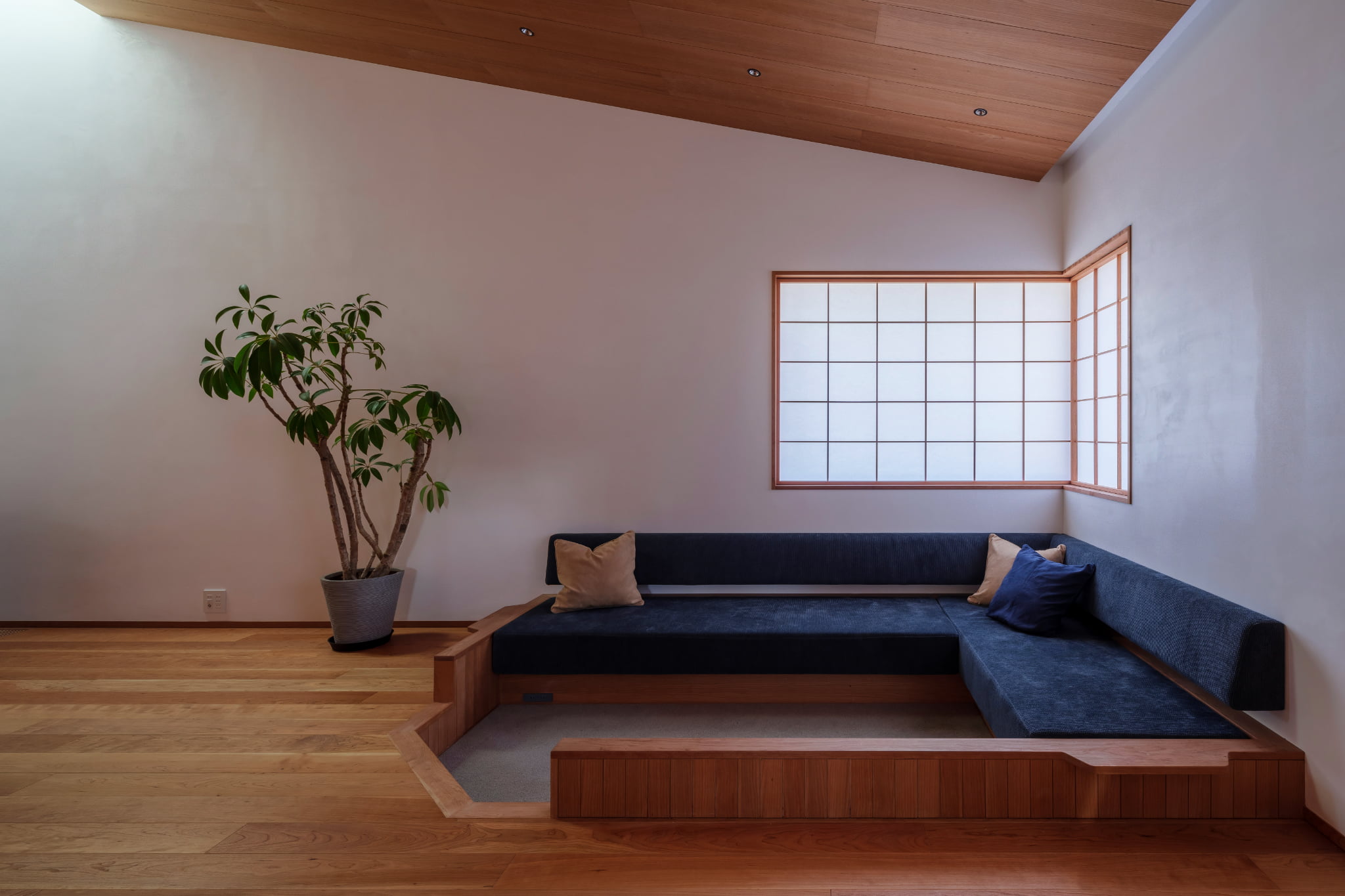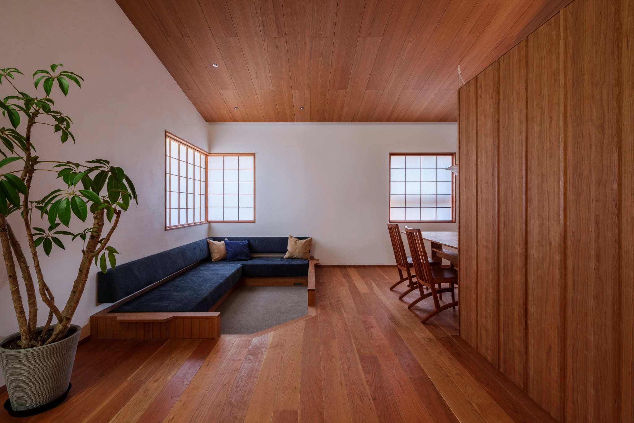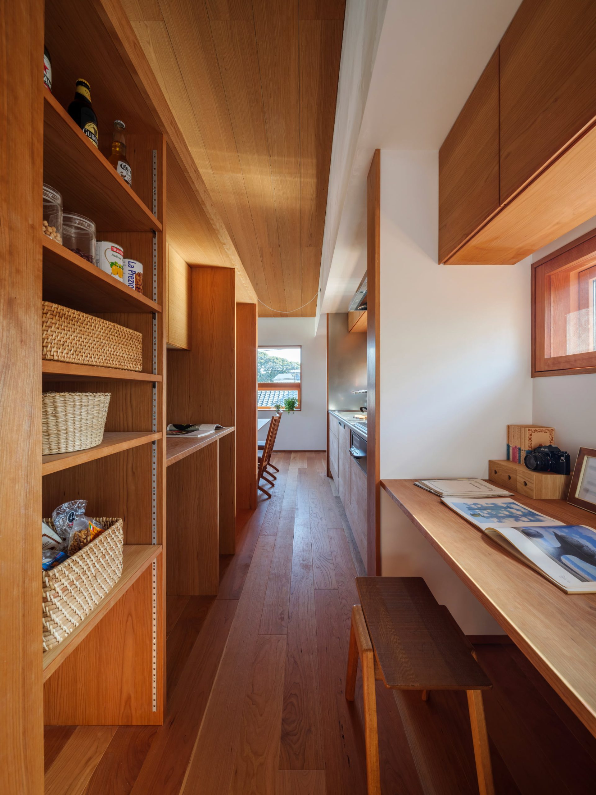 スキップフロアで上下階がつながった空間構成。