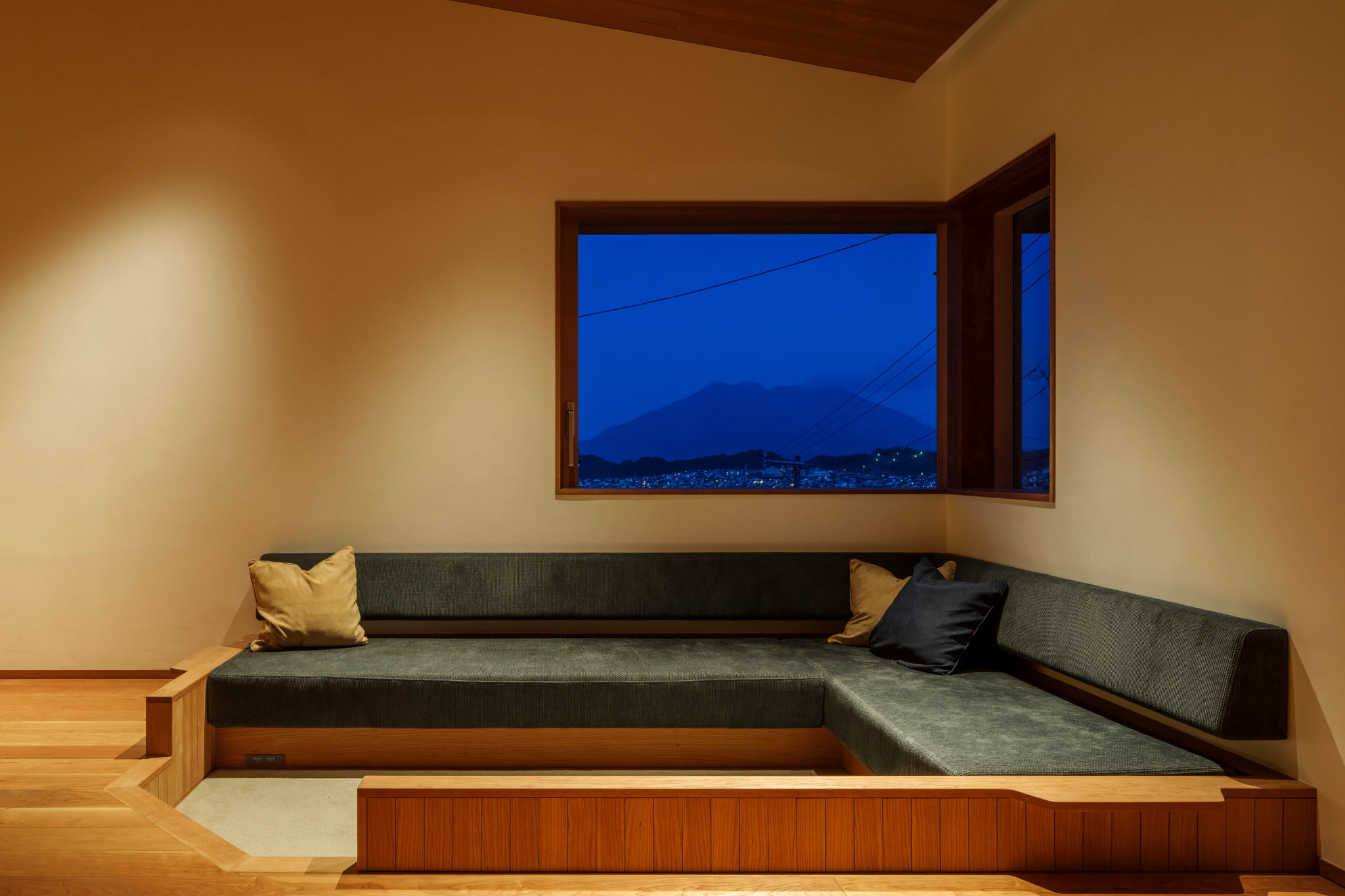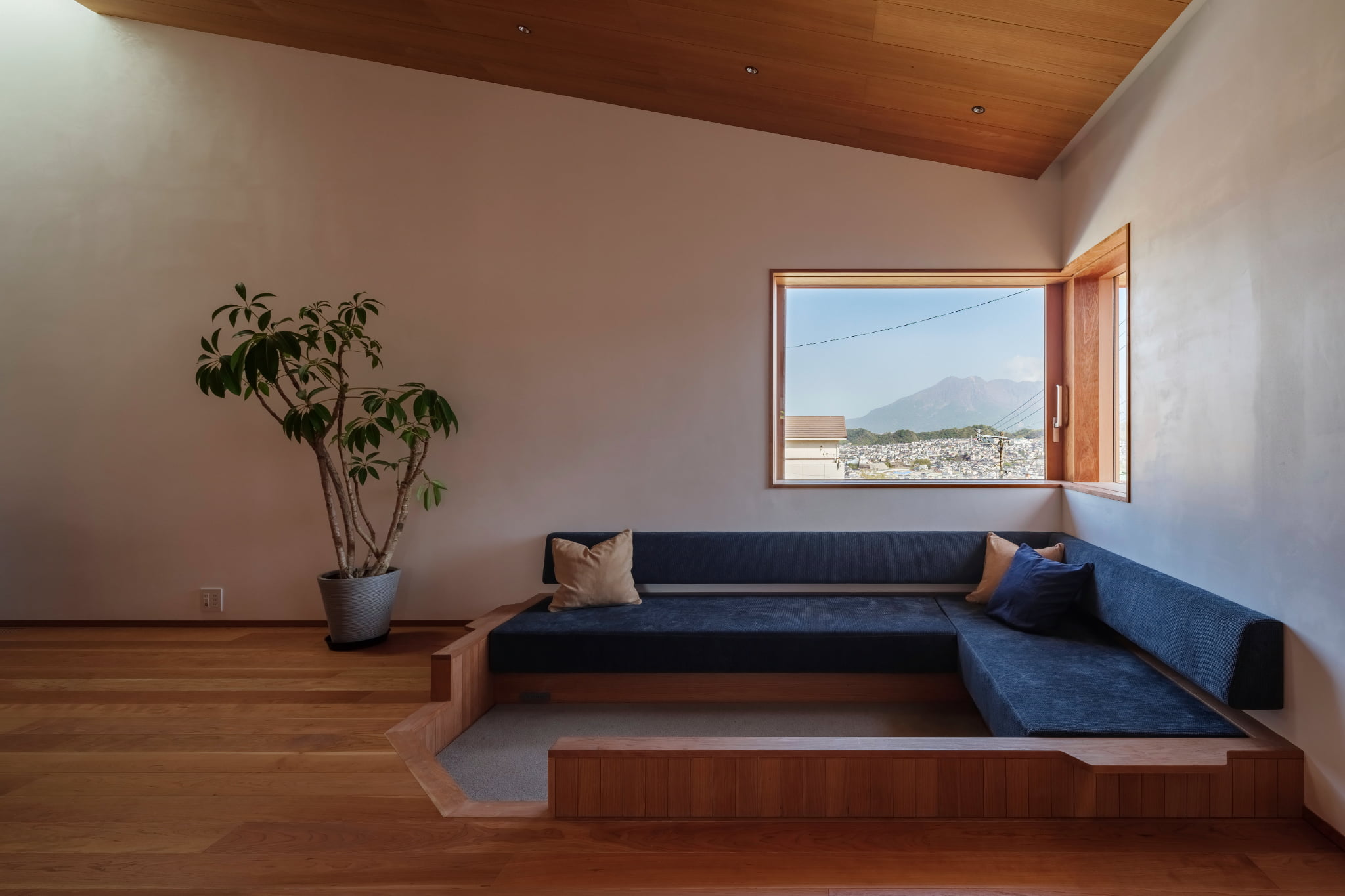 桜島に向けて窓を開く家。