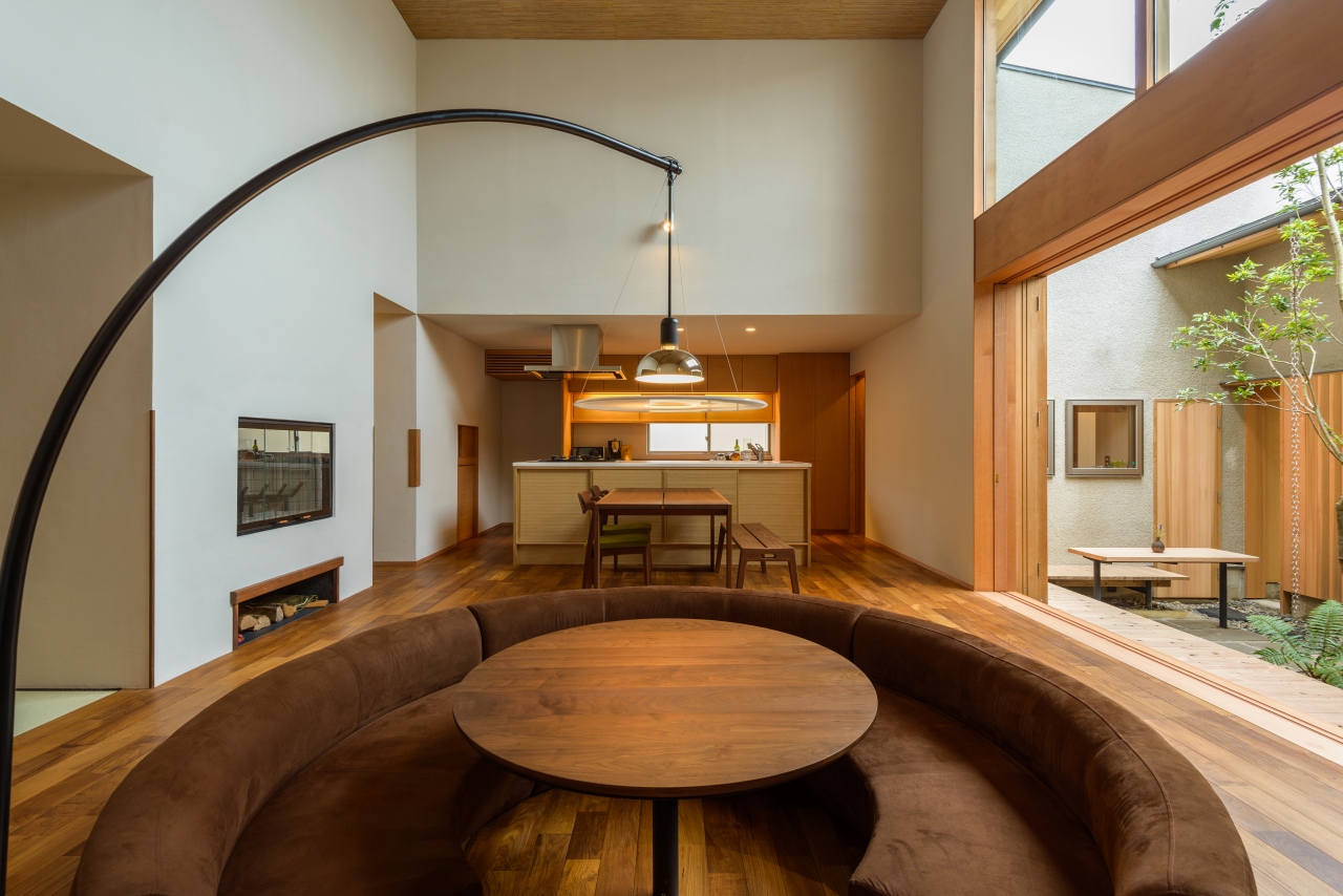オリジナルデザインのラウンドソファーと円卓を床に掘り込み