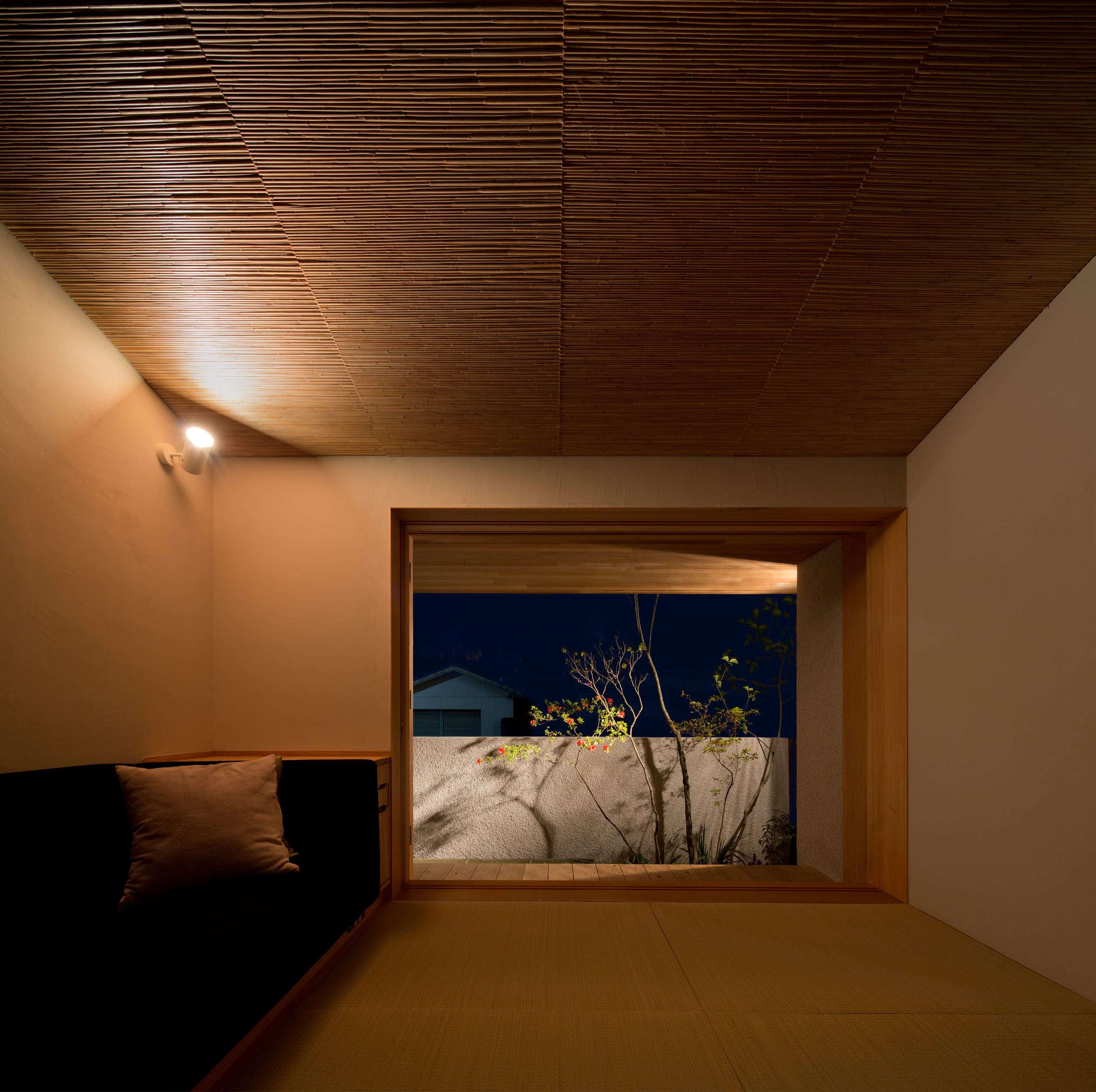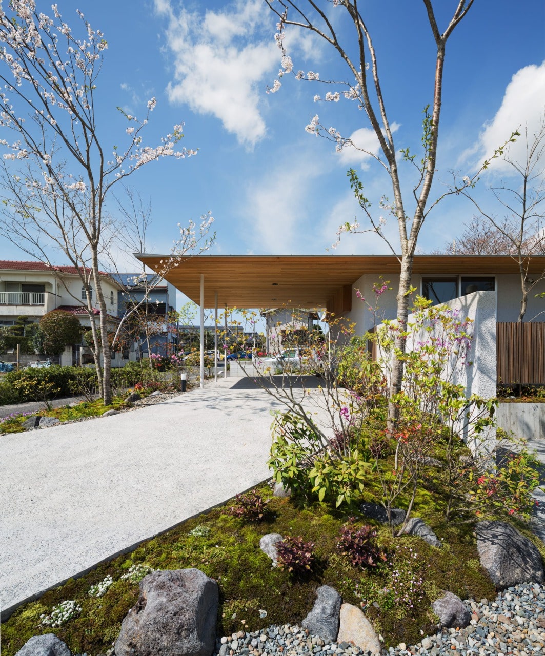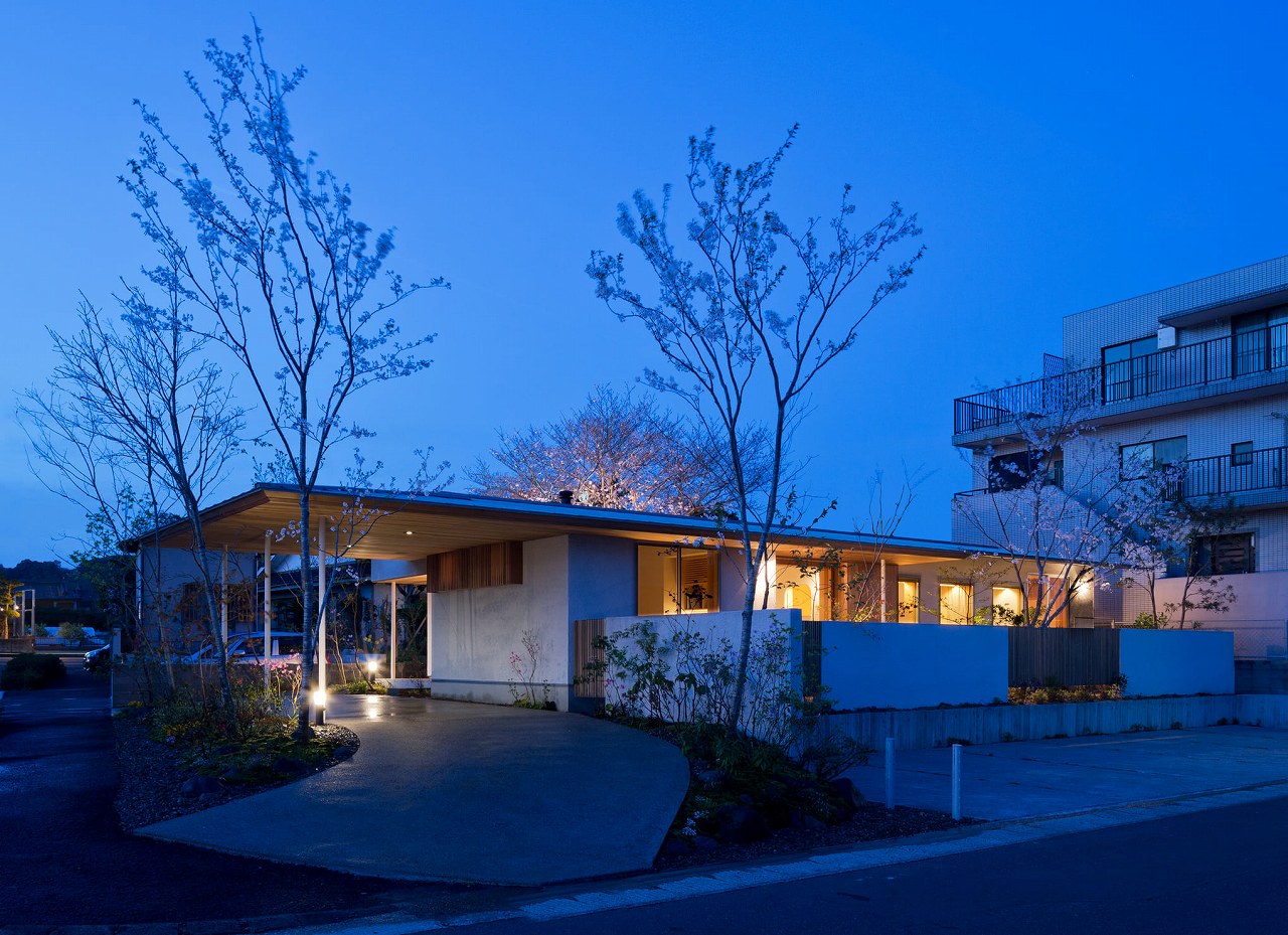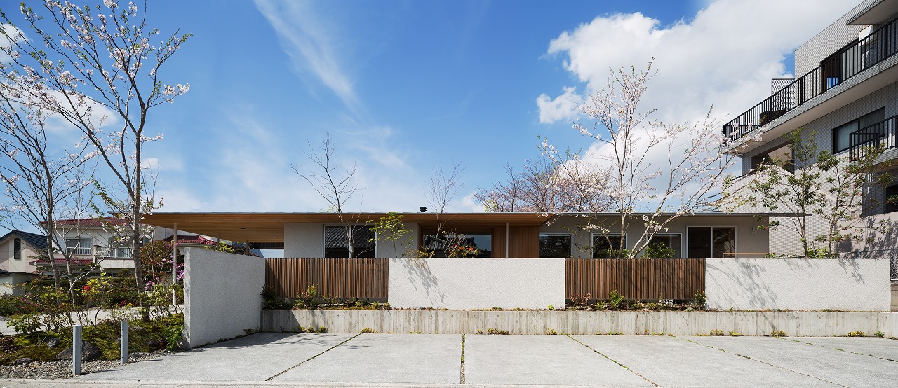 そして水平の屋根が庭の木立の