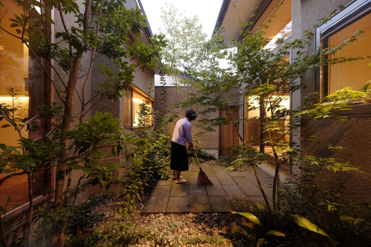 四方を住宅に囲まれた場所に建つ、中庭のある平屋の住まい。