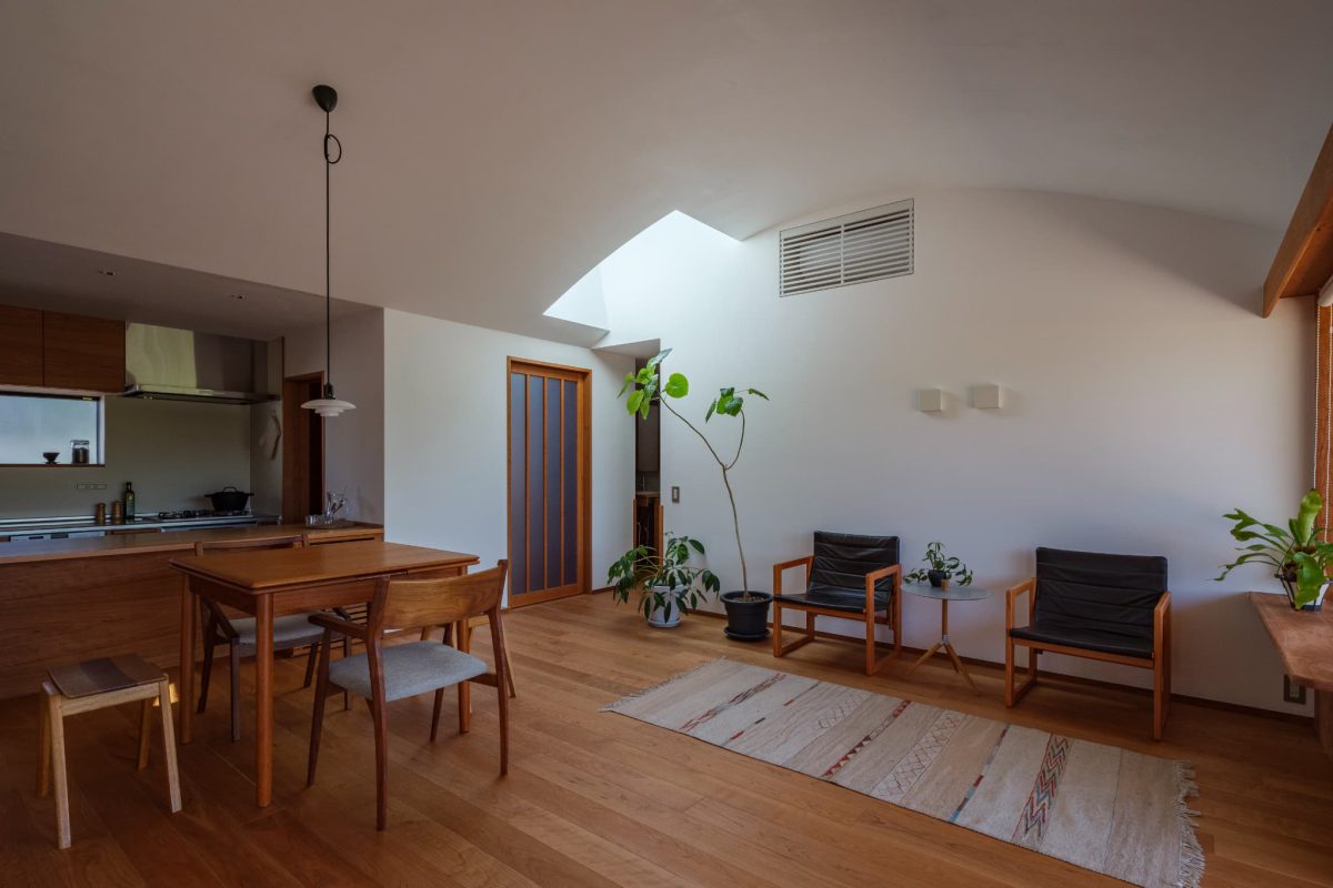 • カーブを描いた天井+漆喰の壁+トップライトで柔らかな光に包まれるリビングダイニング