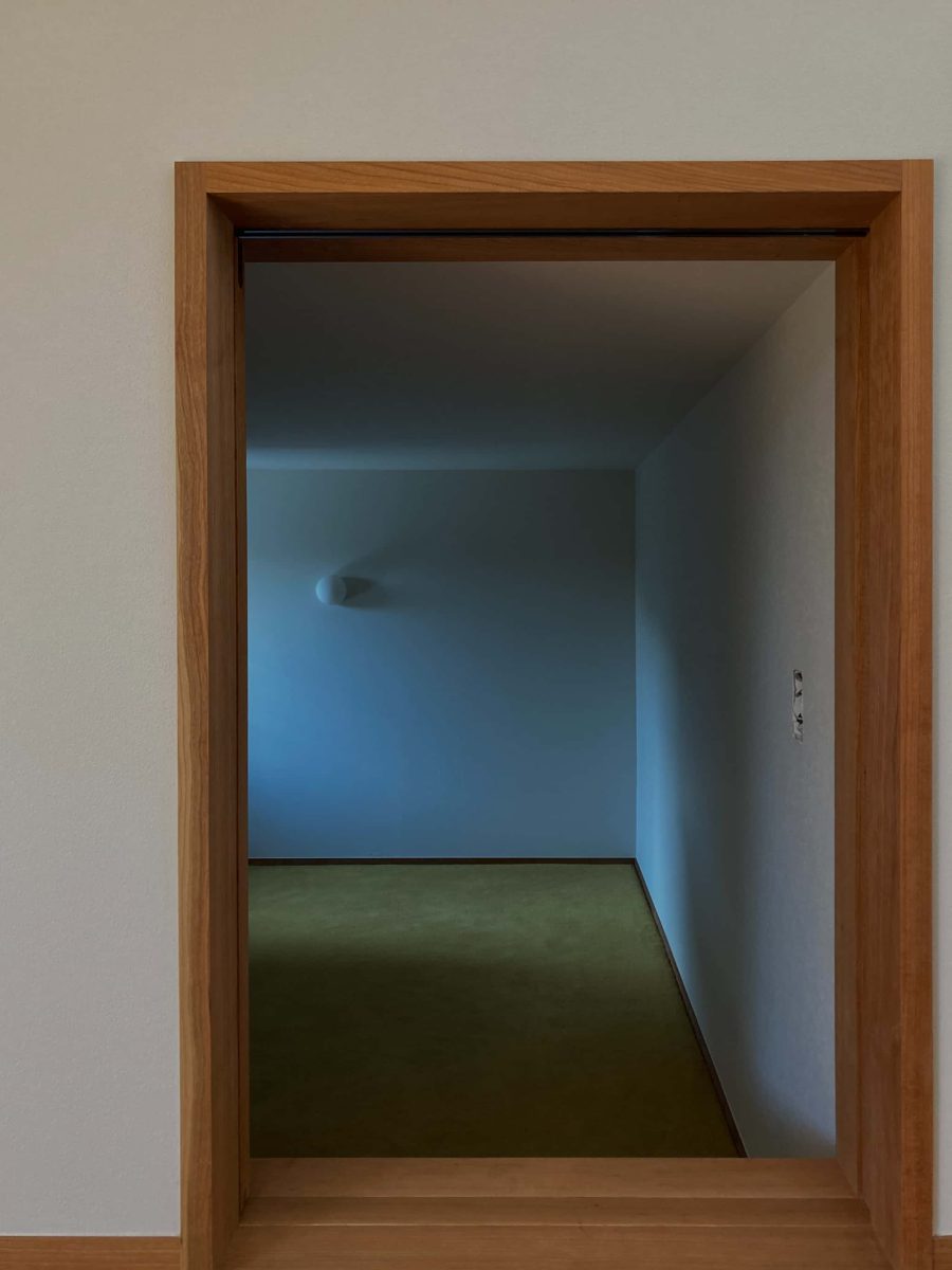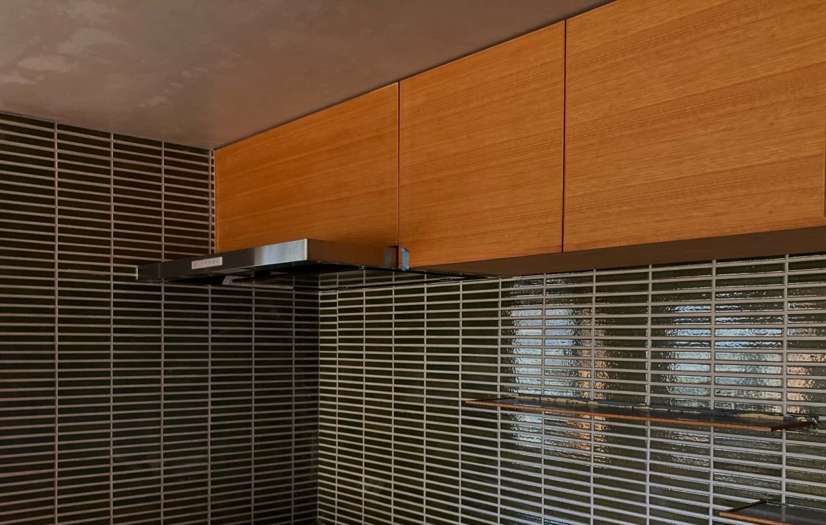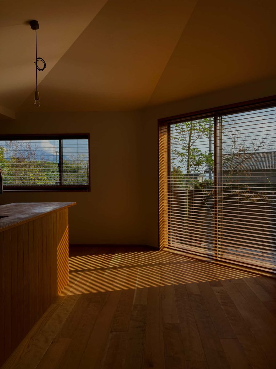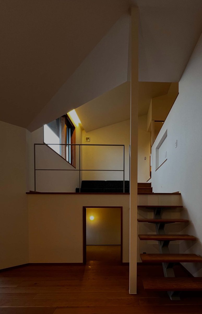スキップフロアで緩やかにつながるキッチン・ダイニング・リビングは、どの場所にいても桜島をのぞむことができる 絨毯敷きの小さな書斎空間もスキップフロアならではの空間 造り付けのオリジナルのキッチン・ソファも是非体感していただきたいポイント 外観はシラスが原料の塗壁「そとん壁」を採用 角地に建つため、屋根の高さや間取りの作り方を工夫して街並みに圧迫感を与えないように配慮 中2階リビング・4人家族