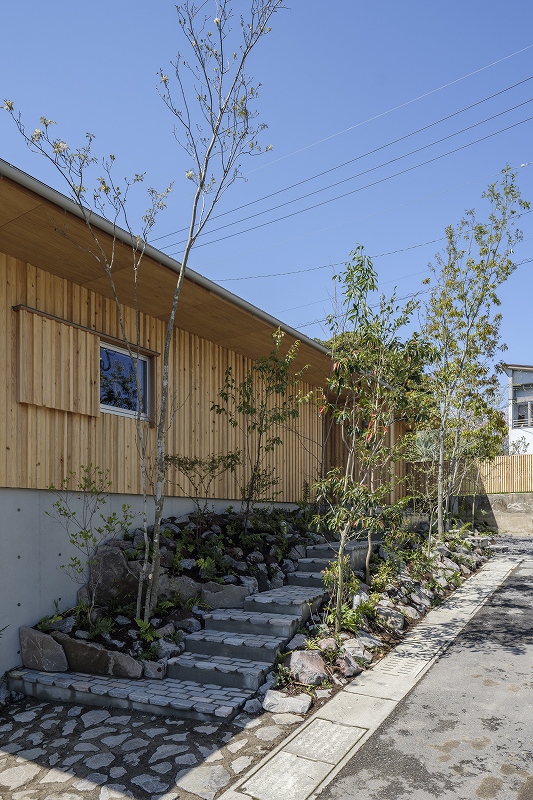 坂道に隣接しており、道路と土地に高低差がありました。上り下りをできるだけ楽にするため、緩やかで長いアプローチに。そこには季節の植物や樹木が植えられ、目でも楽しませてくれます。