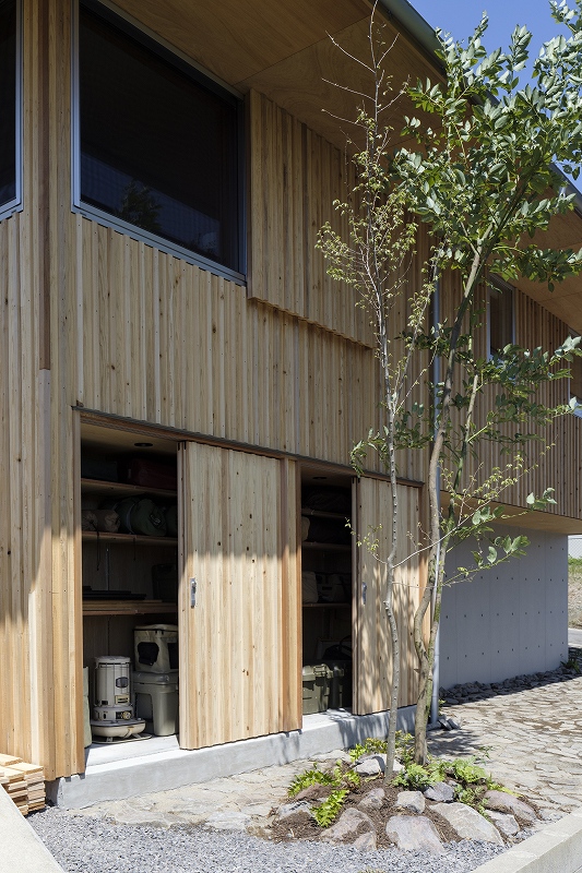 土地の高低差で生まれたスペースに、大容量の外収納を設けました。植栽のお手入れで使う道具はもちろん、テント、焚き火台、クーラーボックスなどアウトドアギアもたっぷり仕舞えます。駐車スペースと同じ場所なので、積み下ろしもラクラクです。