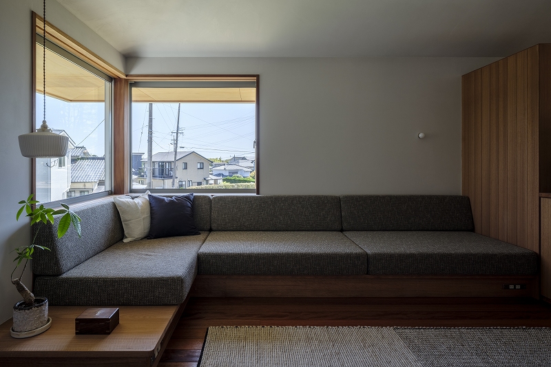 L字の窓辺にピタリと合わせた座面深めの造作ソファ