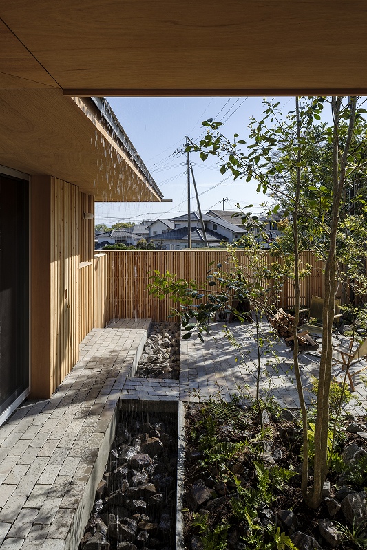 自然の恵みとして雨を眺める 庭に面する軒先には、雨樋がついていません。すると雨が屋根を伝って、幾筋もの点線となって庭に落ちます。家の中から眺めると、それはさながら水のカーテン。ネガティブに捉えがちな雨も、日常の風情としてたのしむためのひと工夫です、雨樋の代わりに軒先の真下には排水溝を隠してあるので、雨水が庭に溜まることはありません。