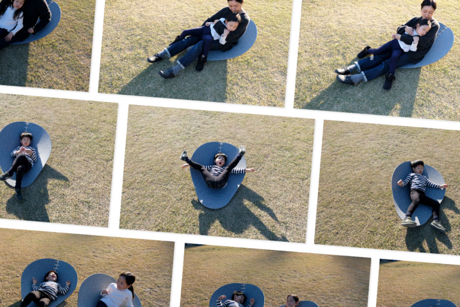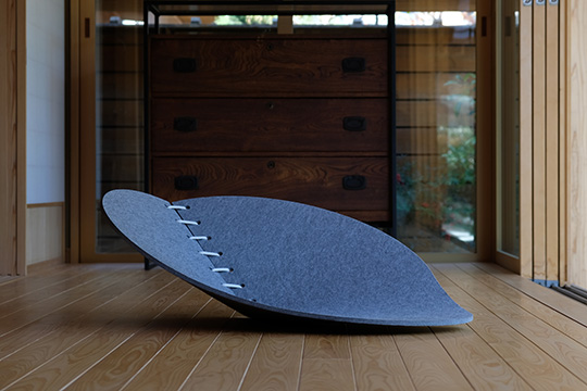 メイン素材となる硬質フェルトは硬さとしなやかさを併せ持つ。そのため小さな子どもと触れ合う「ゆりかご」をテーマとしました。脚のないチェアなので畳敷きと相性よく、持ち運びが用意なためキャンプなどでの使用もおすすめです。