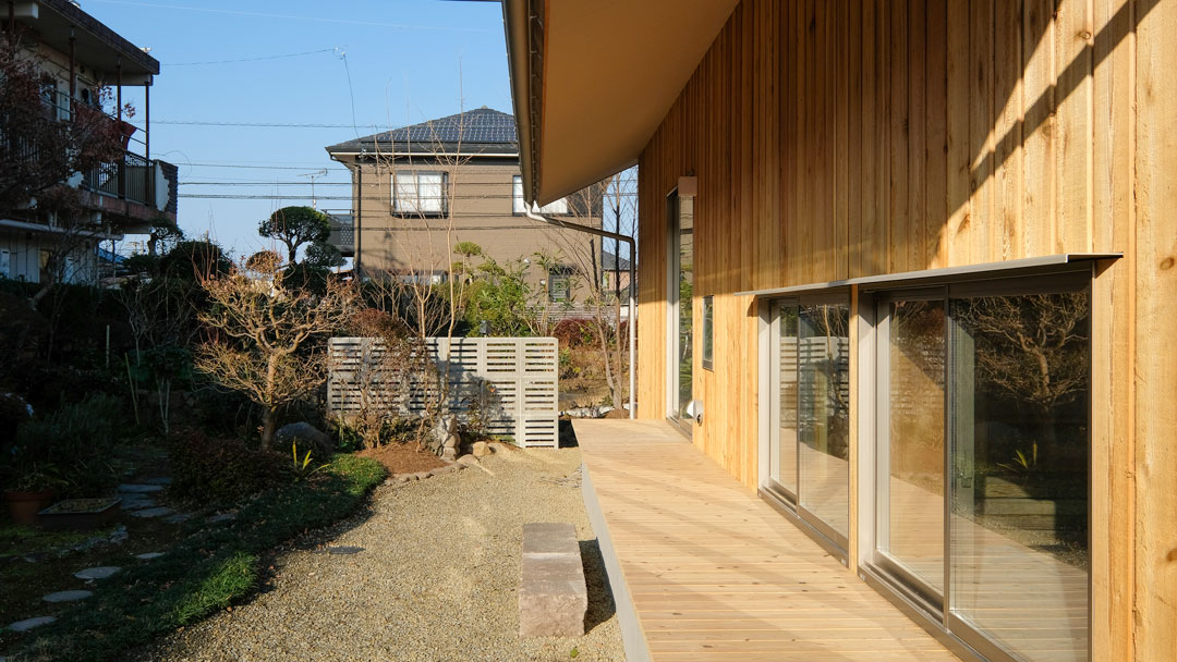 しかし、南側の隣地には2階建てのアパートがあり、庭をゆっくり眺めるためには、そこからの視線が気になった。そこで背の低い窓を設置し、さらに深い庇(ひさし)を付けることで、アパートからの視線をカットした。