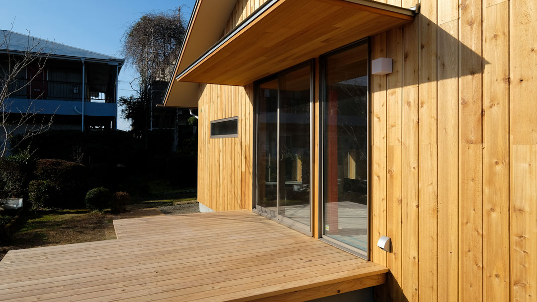 東側は視界の抜けがあるので、建て替えるにあたり、家の中心となるLDKは東側に配置。大きな開口とウッドデッキを設けた。新たに植え込んだ植栽が季節の移ろいを伝える。
