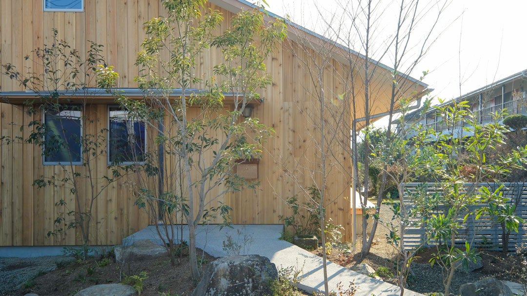 両親が住む実家を建て替えた。南側には両親が大切に手入れしてきた庭があり、これを活かして外構は設計している。
