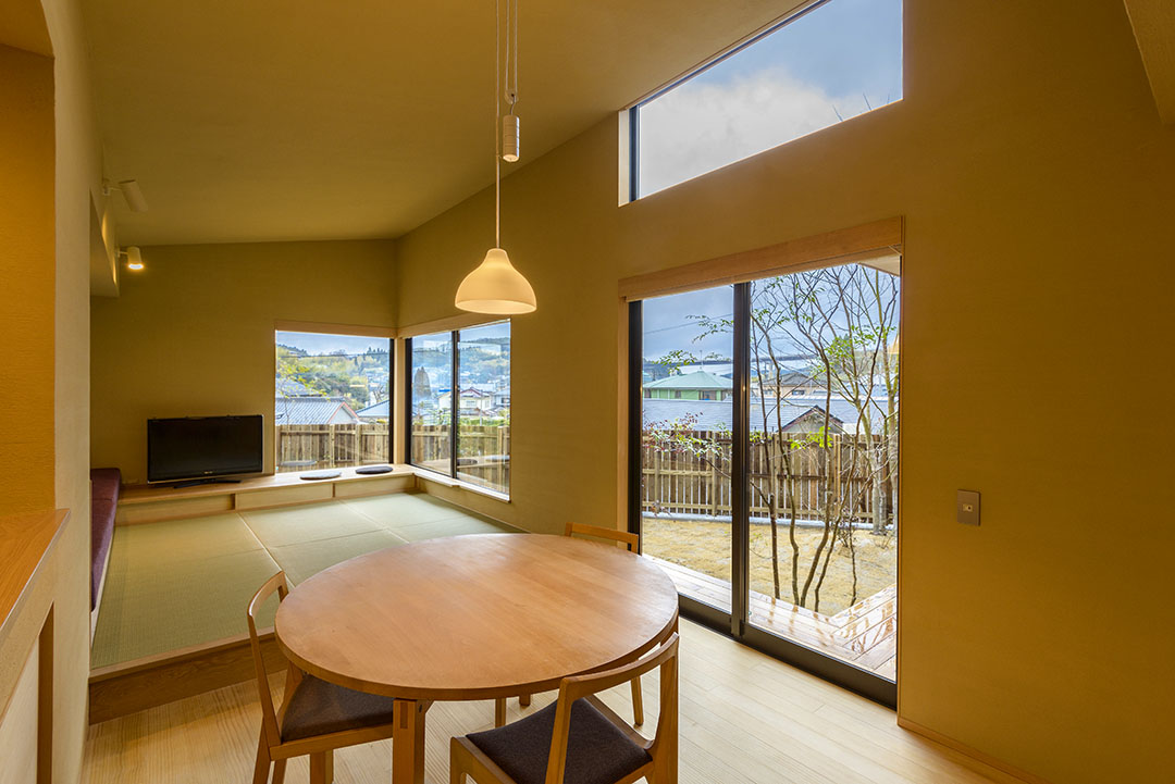 変形地ながら高台・角地で眺めのよい立地。この土地の条件を十分に活かせるよう、家と庭を設計しました。リビング・ダイニング、そして和室からも、中庭と、その先に広がる空を眺めることができます。