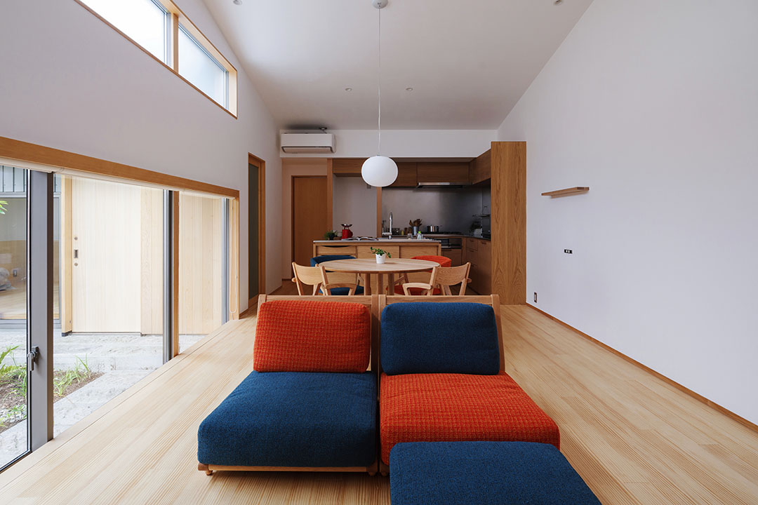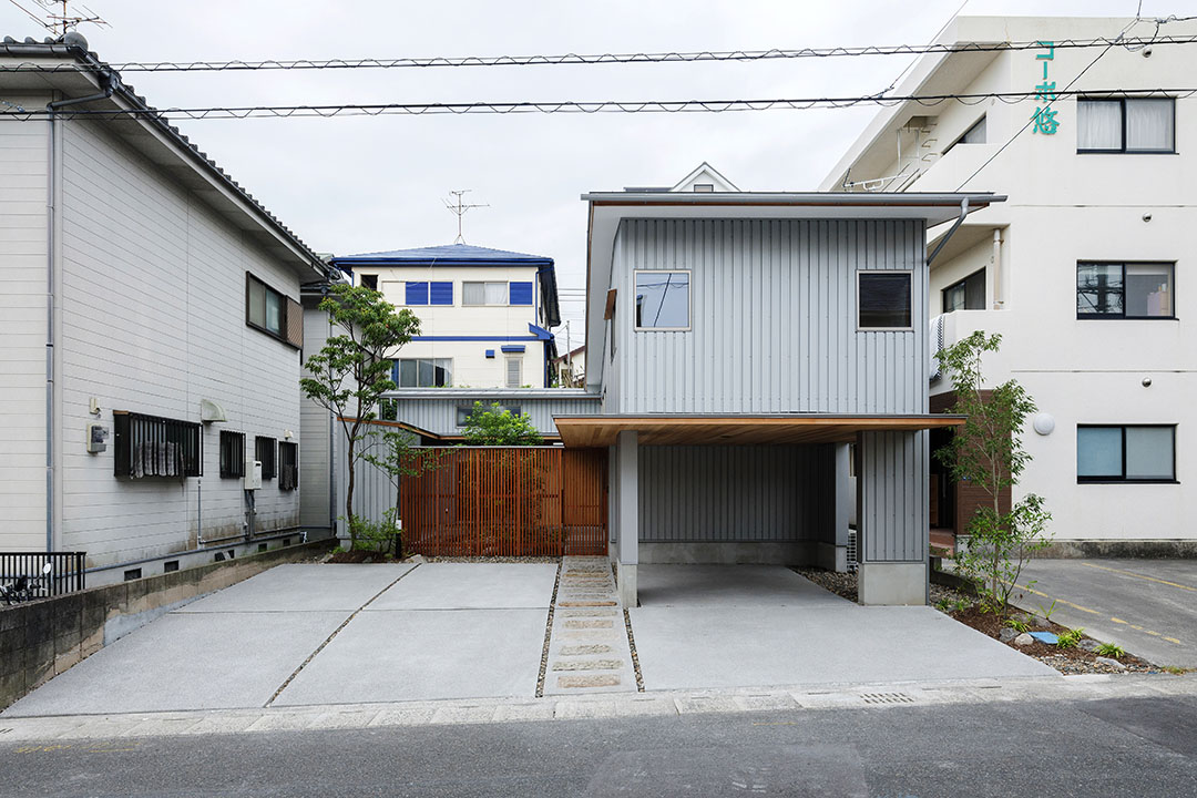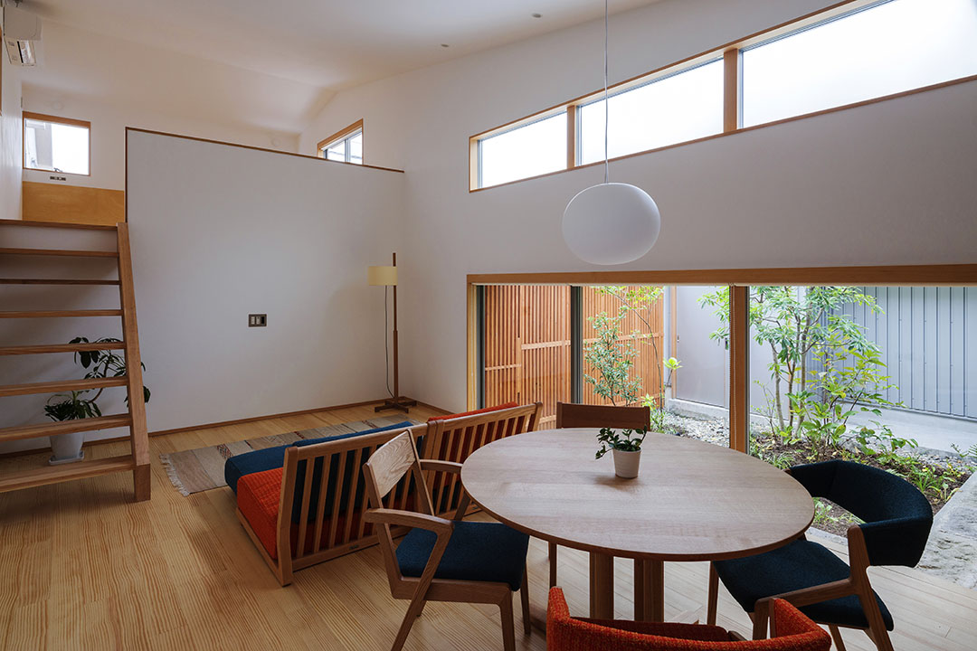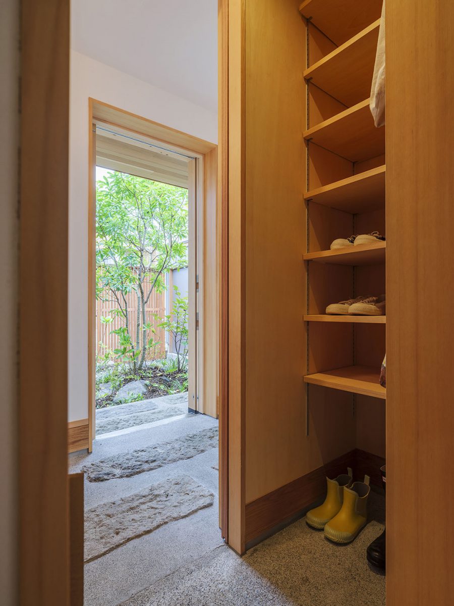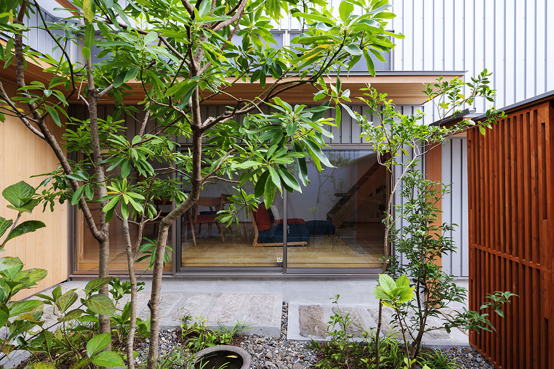 家の中に光と風を送り込むための庭を「光庭」といいます。それを、外壁と格子戸で囲んだ“中庭”の位置に設けました。「光庭」は玄関とリビングに面していて、室内にたっぷりと陽光を取り込みますが、隣接した住宅からの視線は届きません。