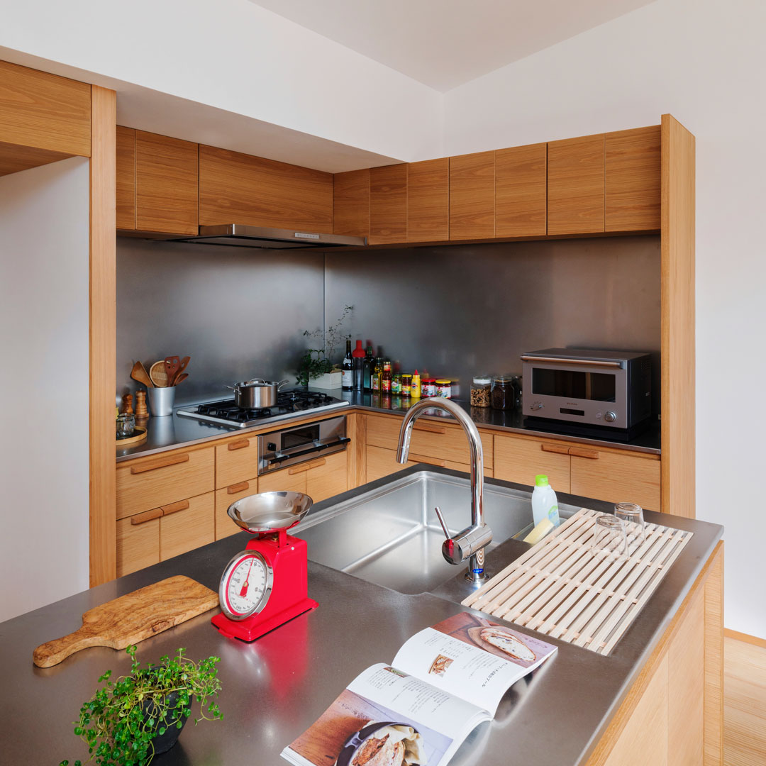 キッチンは、このお家のために設計した造作キッチンです。シンクと調理スペースのあるアイランドキッチンと、コンロや調理器具がおけるL字の作業台を設けています。