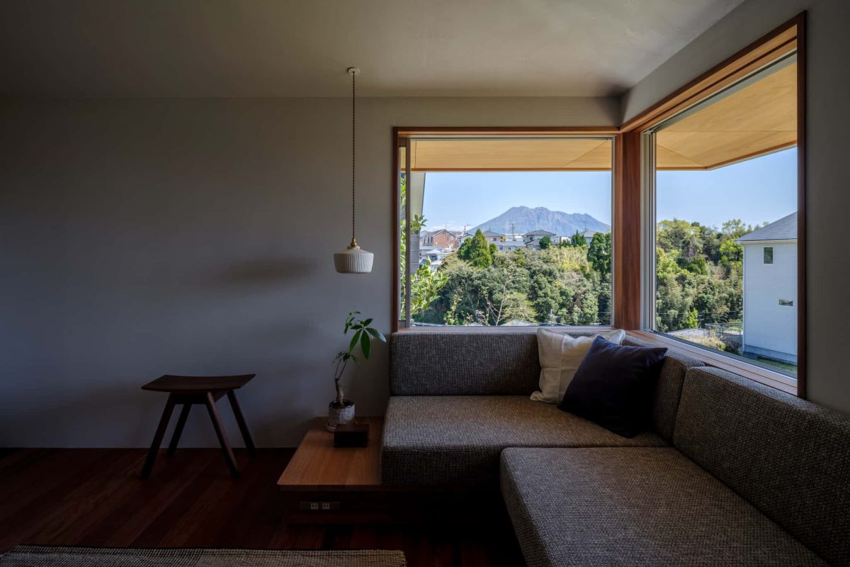 静かな住宅地の中の家々の間から綺麗に眺めることができる桜島