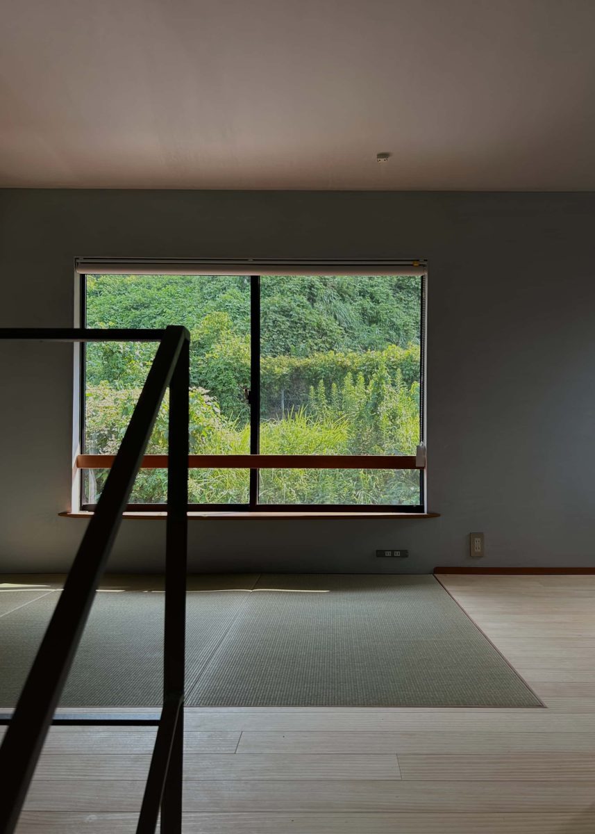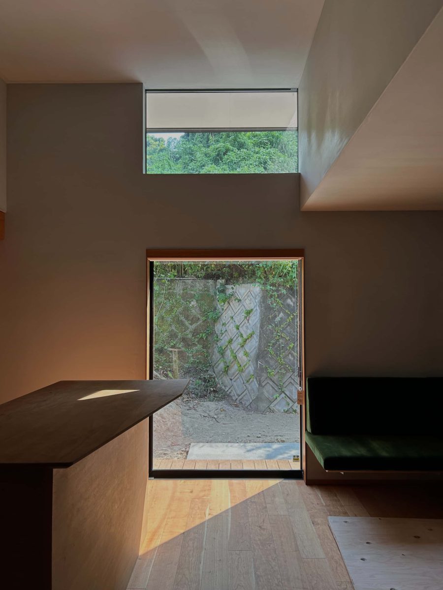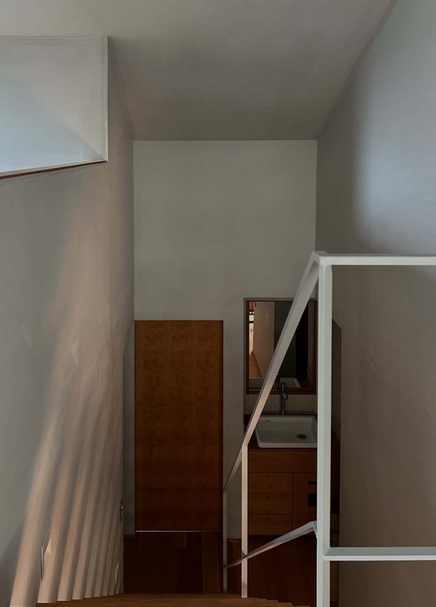 軽やかな鉄骨階段の先には上の土地とつながる大きな気持ちの良い窓