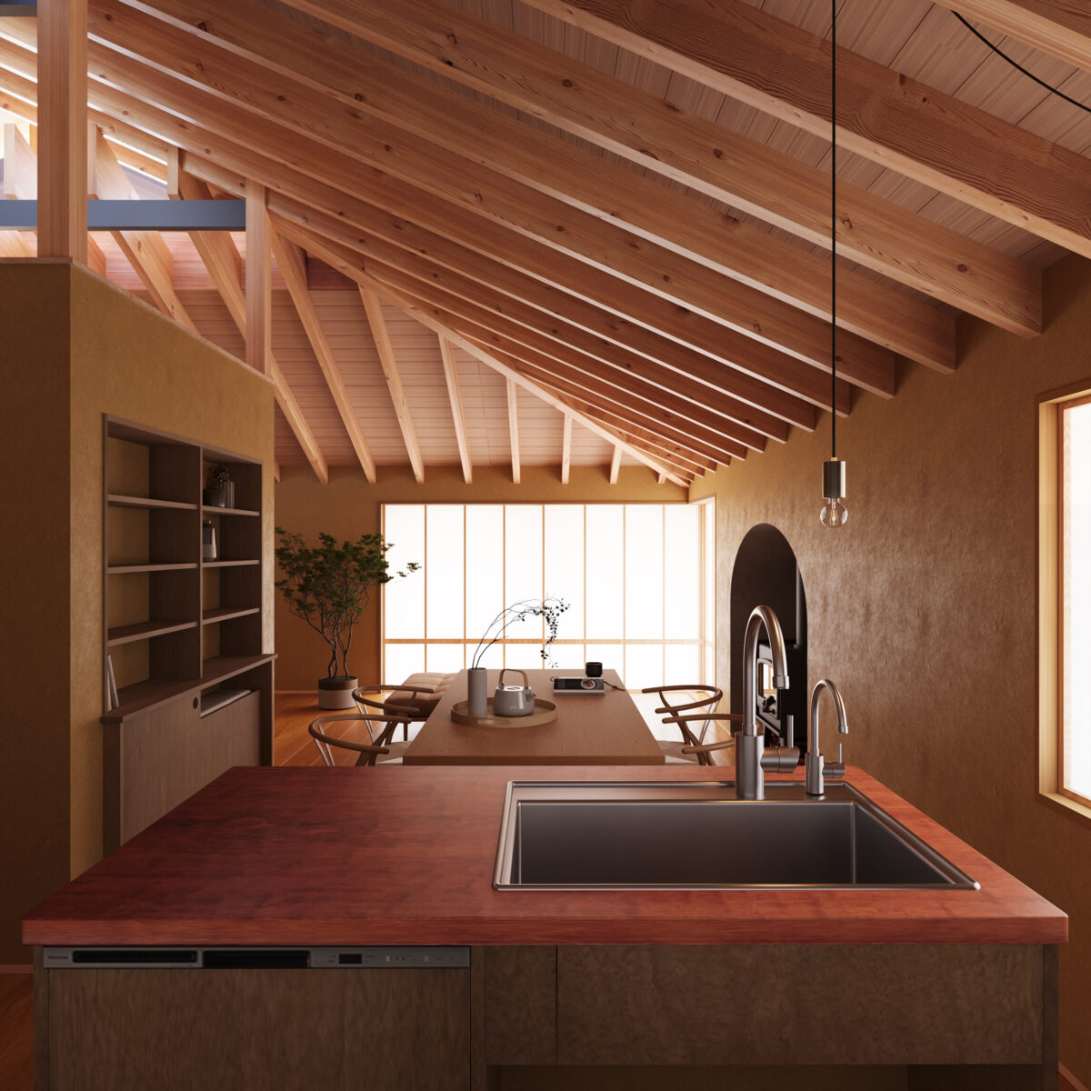 - 力強い構造が見えている木の天井造りと様々な素材を使用したこだわりの内装