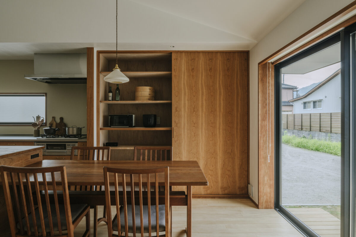 ・造作のオリジナルキッチンと横並びのダイニングテーブル