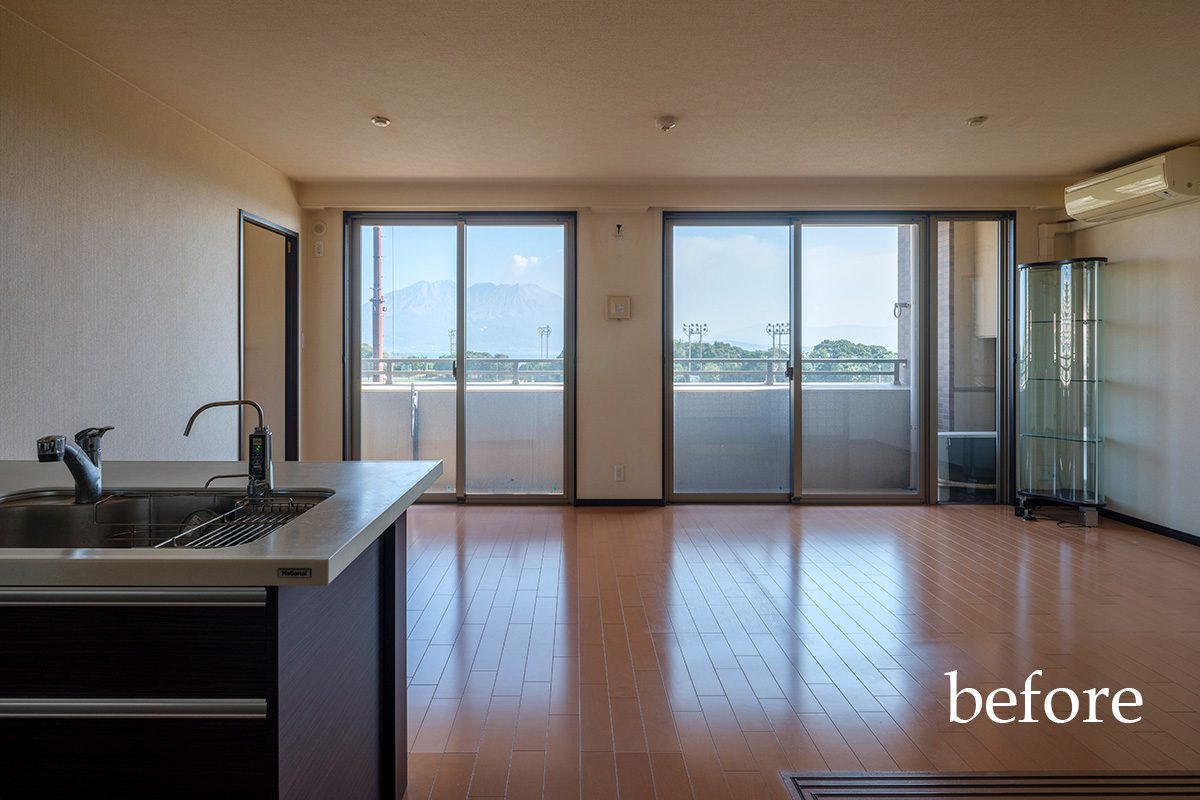 元々桜島を望めるものの、近隣の球技場のライトなどが見えるのが玉に瑕でした。そこで、建具を使って余計なものを隠し、桜島のみを眺められるのように工夫しました。窓全面に桜島を含む外の景色が見える場合と、桜島と空だけを切り取った景色が見える場合の、二つの楽しみ方ができるようになりました。