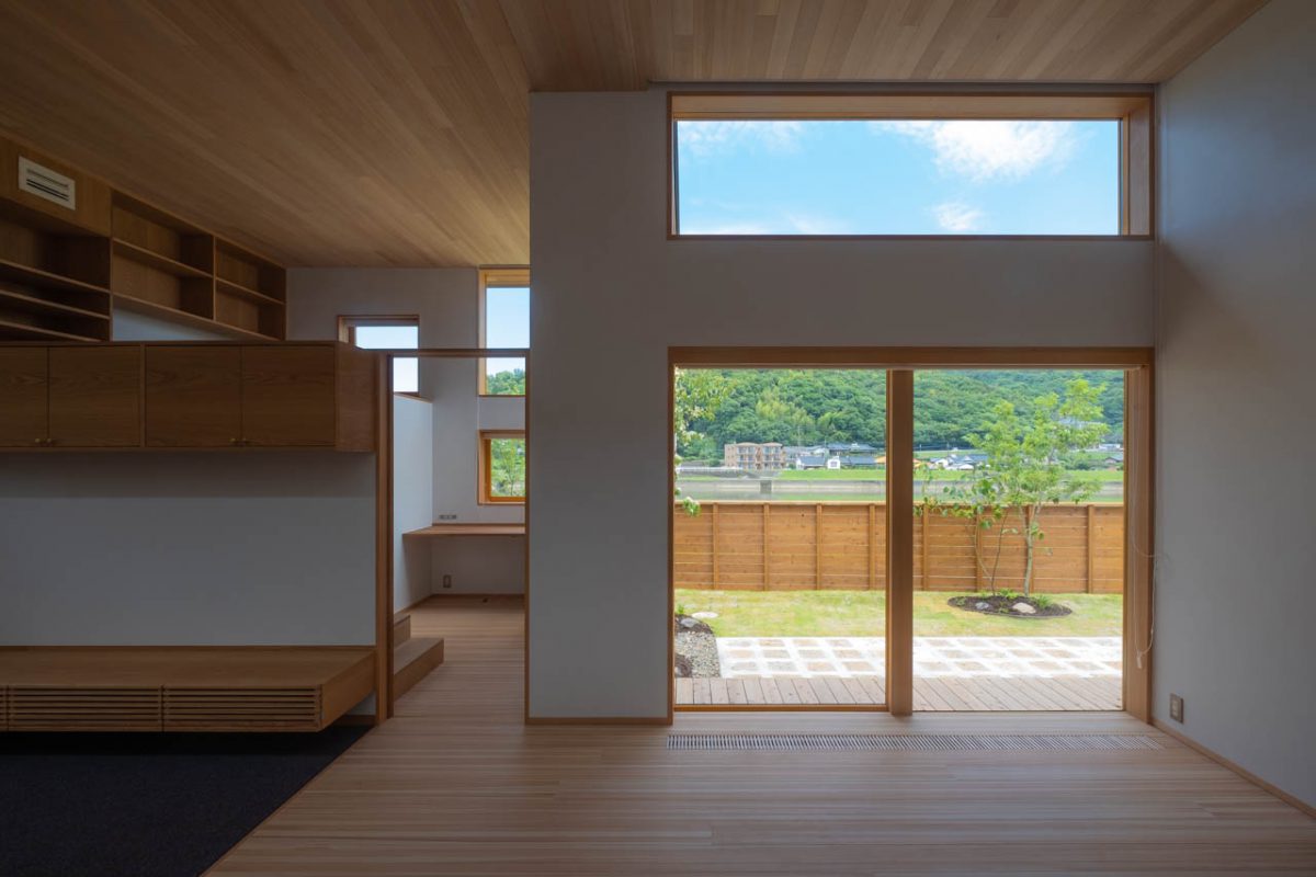 目の前が川という立地のため、吹き抜け窓からは山々と川がきれいに見えます。リビングとダイニング以外に、書斎からも気持ちのいい景色が広がります。