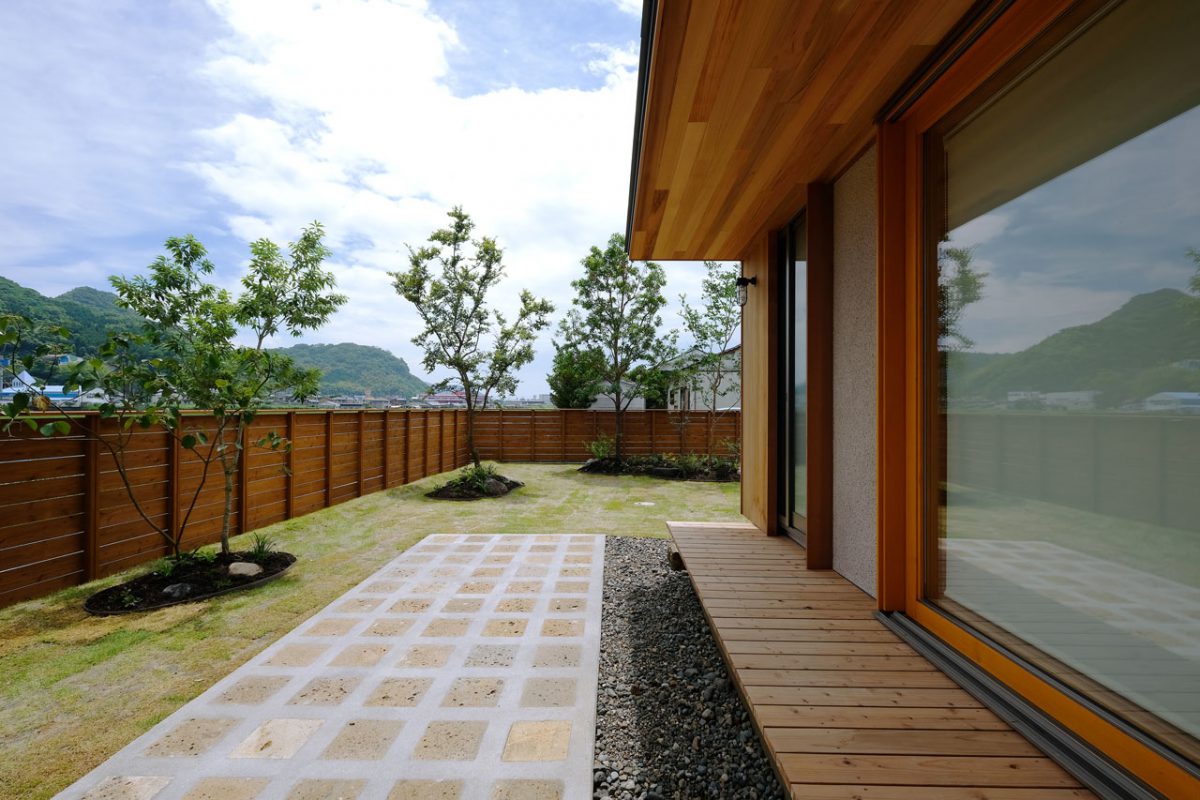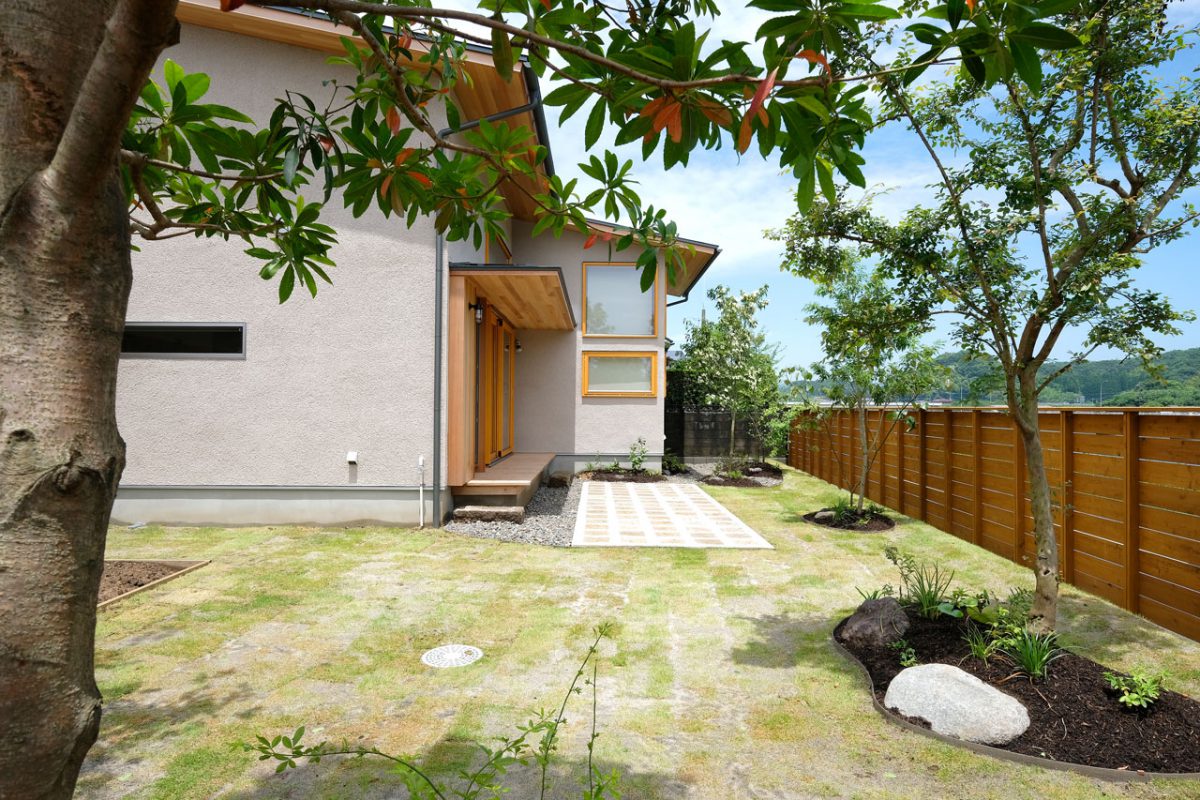 庭と玄関アプローチに敷き詰めた加治木石。反射熱が少ないため熱くなりすぎず、外遊び時にもコンクリートに比べて過ごしやすいです。