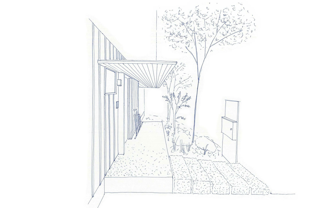 庭に元々あった木を残し、 中でも存在感のある桜が見える位置に、リビング・ダイニング・キッチンを配置しました。家事の合間にも、寛ぎの空間の中でも、庭の木々を感じられる間取りです。