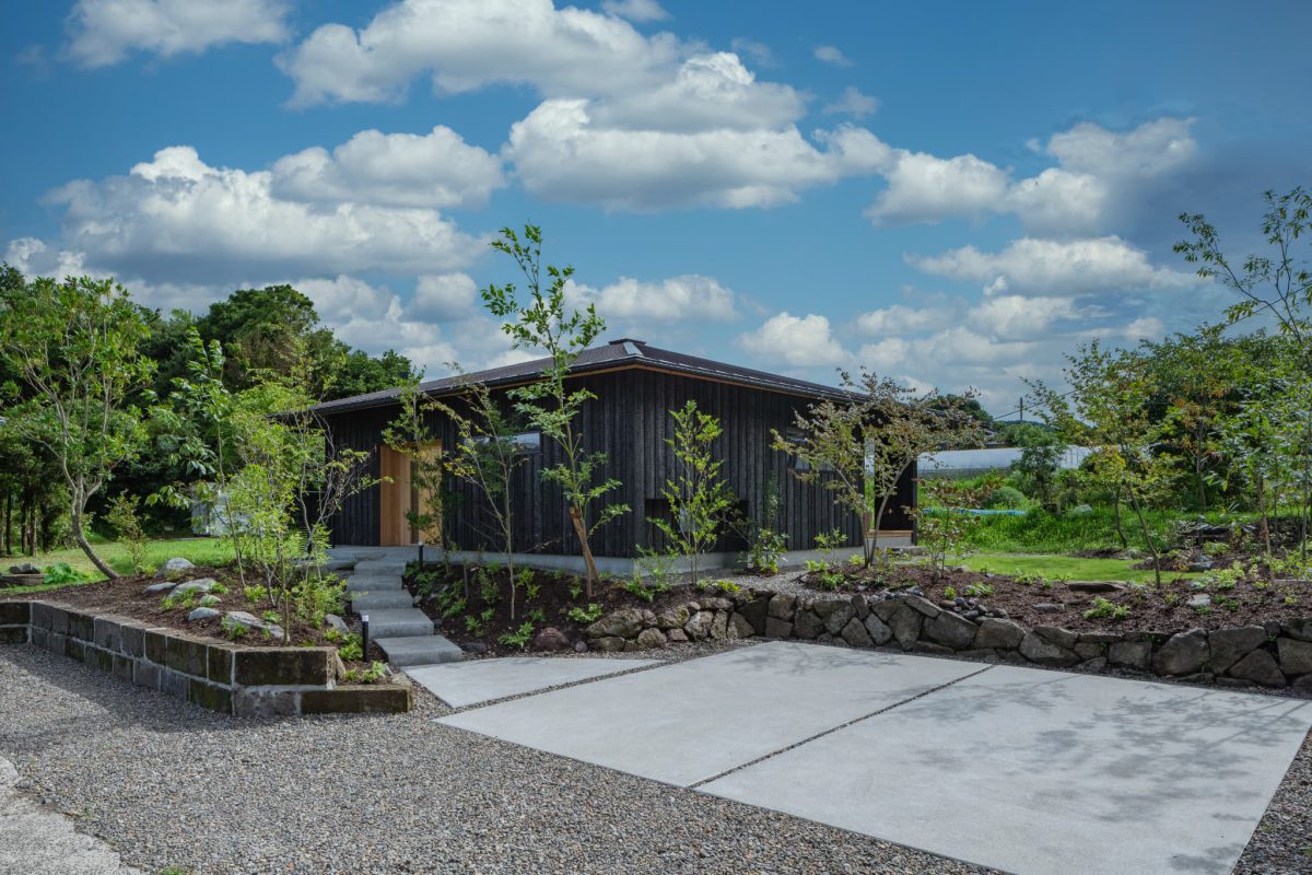 - 高低差のある土地を活かした緑豊かな外構計画。