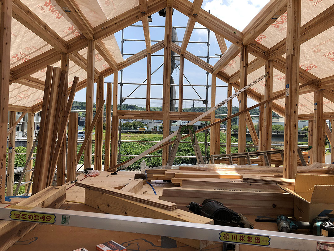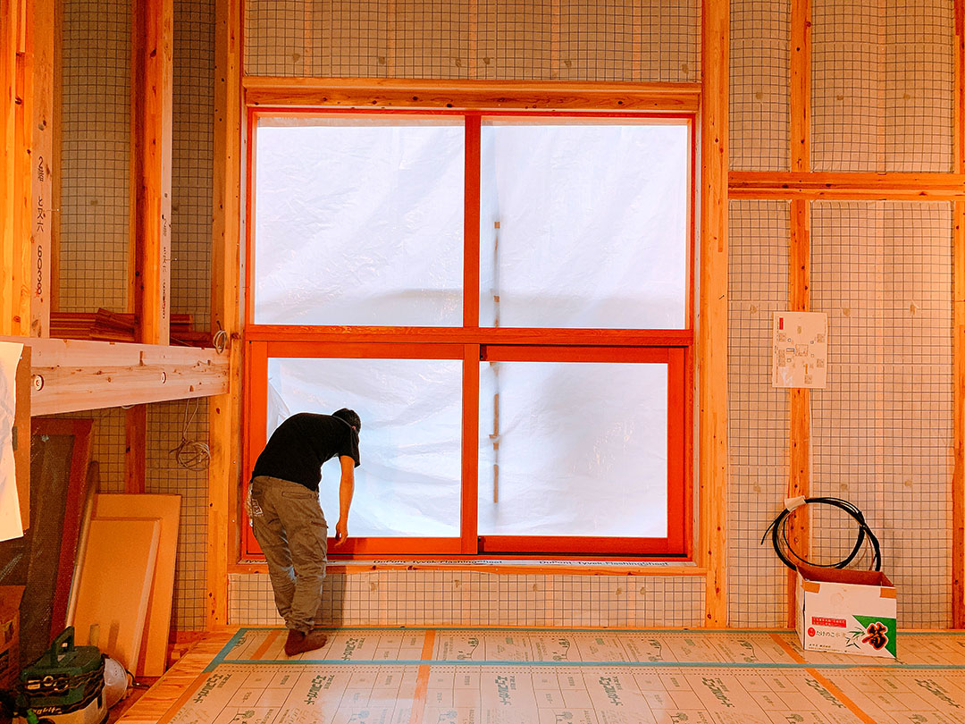切妻屋根を大きくかけて、道路からよく見える東面には、木製の大きな十字窓を。この窓から家の中に、奥へ、奥へと、光をいっぱいに取り込みます。