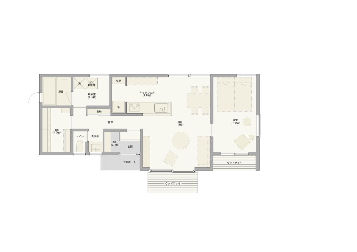 ☑︎敷地44坪、駐車場2台確保、コンパクトで豊かな平屋