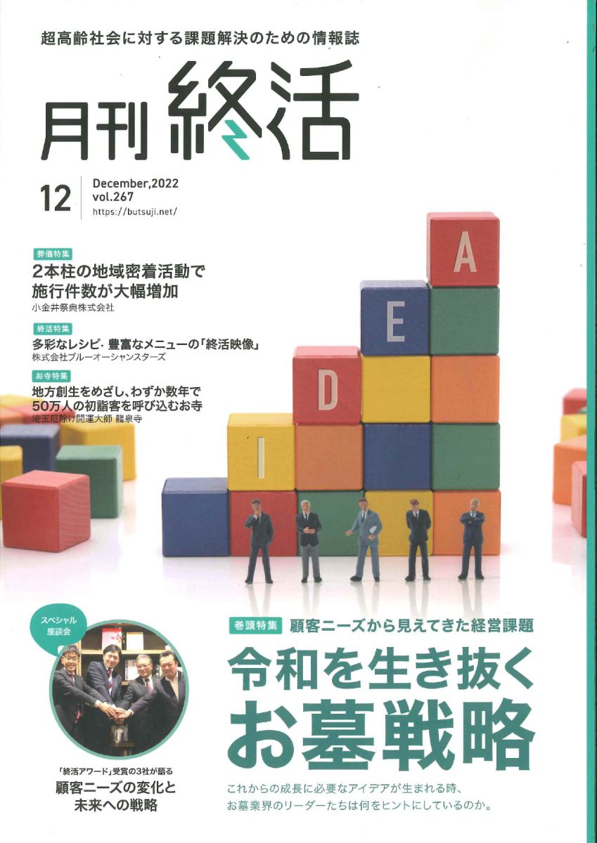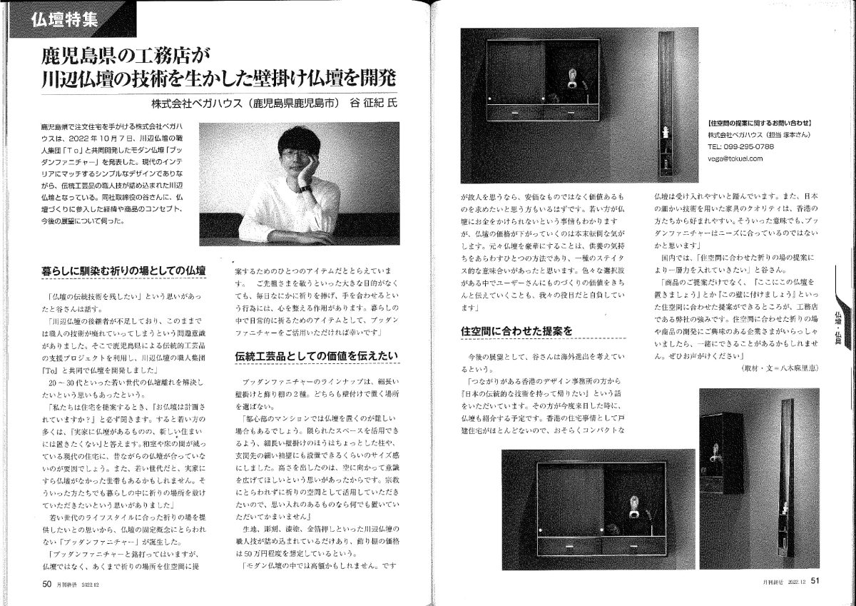 『月刊終活』2022年12月号の仏壇特集にて、川辺仏壇との共同プロジェクト「ブッダンファニチャー」が掲載されました。