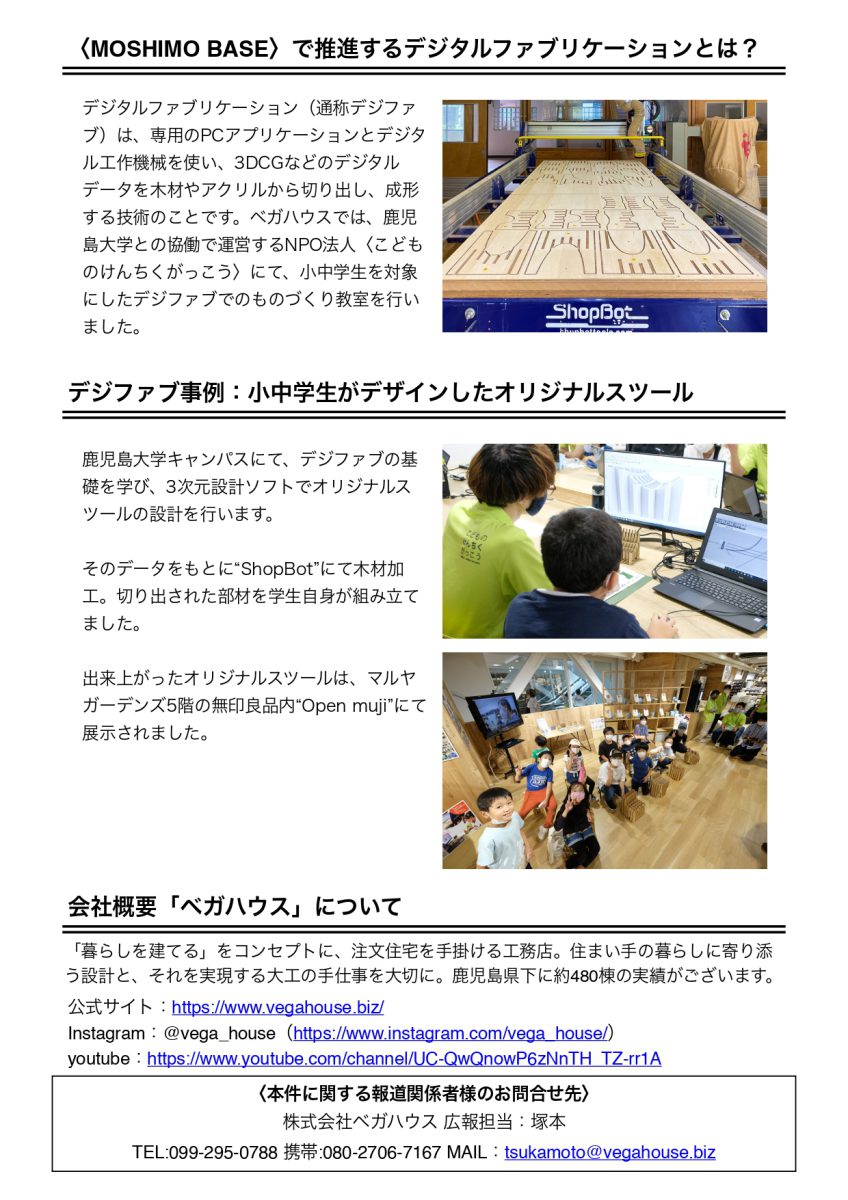 5月22日(日)にCNCルーター“ShopBot(ショップボット)” を設置する 工房〈MOSHIMO BASE〉を落成いたします。鹿児島市石谷町の本社敷地内にあり「デジタル データによるものづくり=デジタルファブリケーション」を推進する施設です。鹿児島県の実施す る『木とふれあう環境づくり推進事業』の支援も受けています。