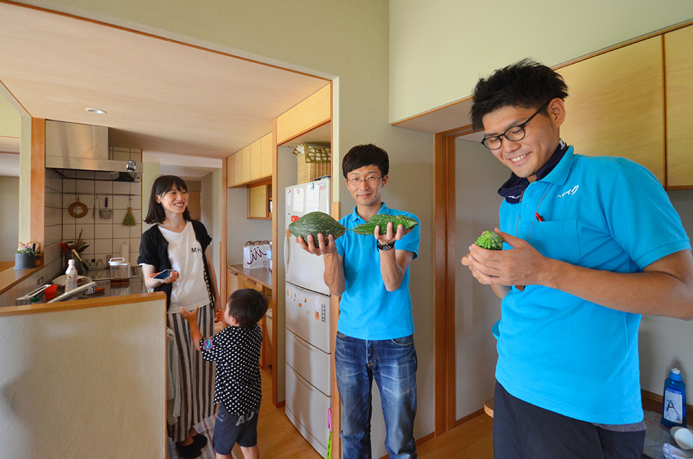 二人のお子さまも、今では畑のプロ。畑の道具をしっかり使ってご主人のお手伝いをしたり、ときには収穫した野菜を使って、奥さまと一緒に料理も楽しんでいるそう。「見て見て!」と、いろんな野菜を紹介してくれました。普段なかなか体験できなさそうな作業も、この環境(今のお家)になっていろいろ経験できて、子供もいい勉強になっています、とご主人。お子さまのきらきらした汗と笑顔がまぶしいかったです。